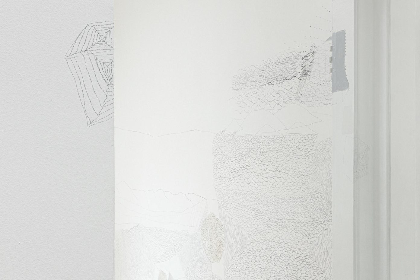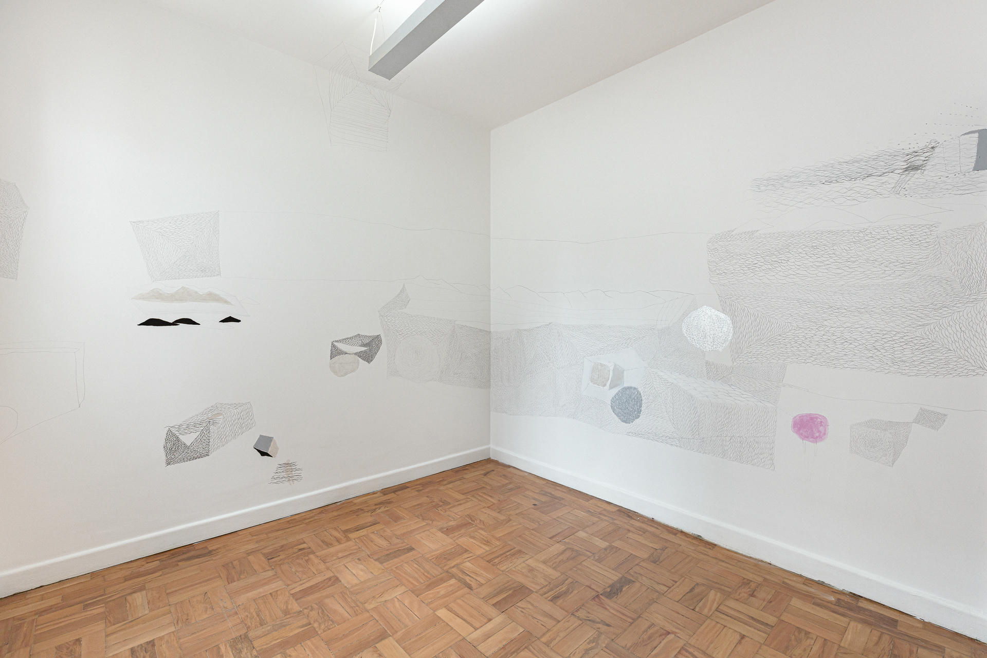 Fundamentally an artist who explores the characteristic of the automatism of drawing, in her critique of the genre, Gallinari develops a research of its possibilities of activating the sensitive, more precisely the gaze. This is a very present mark in the artists that emerged in the second half of the 1980s. In her particular case, the occupation of the physical spaces where she presents her wall drawings is in a way an exposition of an ethic regarding the place we are in the world and how this relates to the intuitive and fluid aspect of drawing. Without a preconceived project, or a definition of what will be done, the work takes place in the time of observation, meditation, or accumulation of the stories lost behind the walls that delimit the space it occupies. Its details, its folds, and its perspectives, after being absorbed by the artist, almost like a dialogue in reverence to that which is given before her fragile human condition, in this encounter arise the indications of the possibilities and plasticity of the drawing, its volume and final occupation. The contemporaneity of her work goes against the current deterministic where everything is a project, everything seems to have to be explained or exteriorized a priori, when inverting this temporal arrow, drawing is the field of the flow of experience, most of the time, mental without a certain address of arrival.