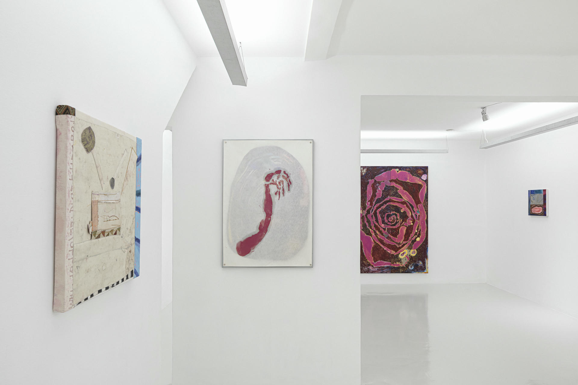 O corpo feminino reaparece em outra pintura presente nesta exposição, desta vez em figuração de êxtase. Borbulhas de amor (2024) é um díptico e um compósito, compõe-se de duas telas e uma porção de aglomerados. Nessa pintura há um erotismo difuso, que se manifesta na tela superior na imagem de um par de pernas abertas, brancas, meio azuladas, em contraste sutil com um fundo rosa, claro, liso e homogêneo. Entre as pernas, na área onde estaria a genitália, dispõe-se costurado um pedaço de tecido em forma de peixe. (O título do trabalho logo implanta na cabeça a continuação do refrão: “um peixe, para em seu límpido aquário mergulhar…”).