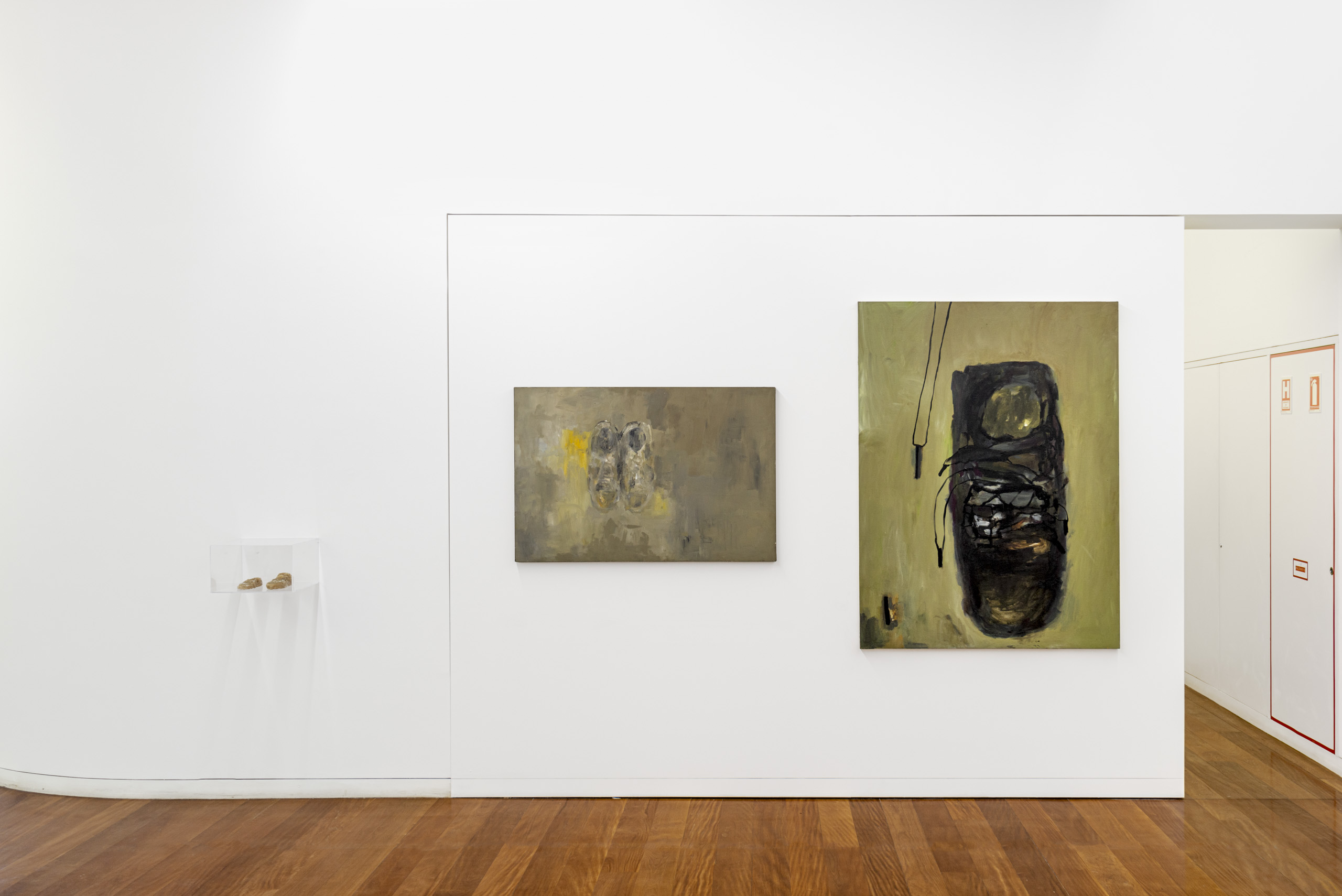 In these works, the shoes are almost always seen from top to bottom, mostly unclothed, loose on the plane, with a single foot of a pair in the picture. The color palette is also restricted, reduced to black, white and yellow, with occasional insertions of reds, greens and blues. But in contrast to these narrowings, there are many solutions. There are graphic works, with light strokes, decided by observing the object and produced with black paint, which draw the sneakers; there are others with a lot of material, applied in energetic brushstrokes, which drag a thick paint across the surface, like mud, and cross each other, on the edge of the shapeless (Tênis Respingo, 2012); there are canvases in which you can barely make out the shoes or any figure (Tênis Batom, 2012); just as there are silent, lowered paintings in which the shoes, seen from above, rest almost in the center of the painting, slightly to the left, while their boundaries fall apart and blur, almost under smoke, with the surroundings, in a greyish image, with a little yellow on the sides of the objects (Tênis Ela, 2010).