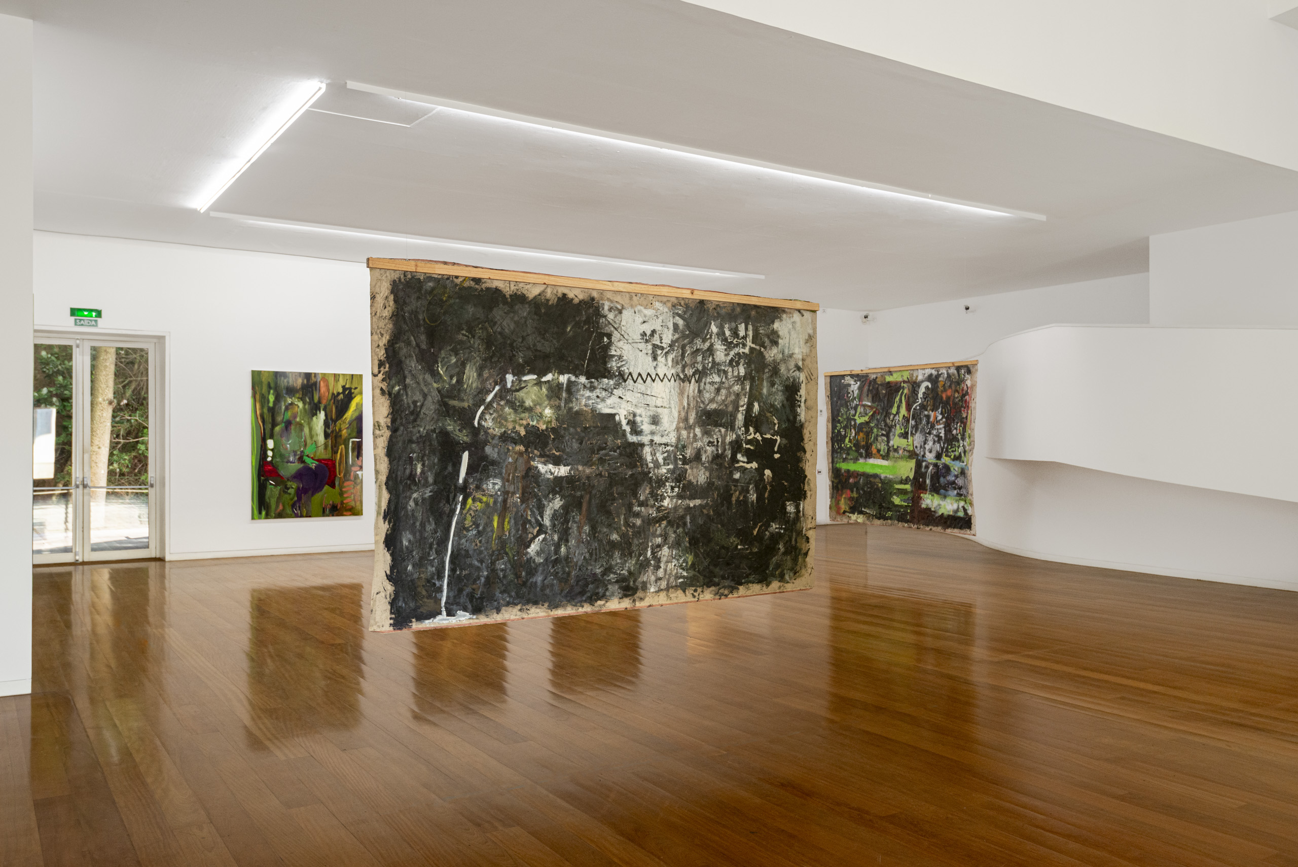 Even though black prevails in these works, retrospectively, the insertion of other colors, such as reds and greens, always in an unrestrained way, without apparent restrictions or limitations, is striking. It was also at this point in her career that Luciana Maas began to add spray paint to her paintings. At first, the spray contrasts with the oil paint due to the flat lines of color that extend, in the foreground, over the dark, viscous mixture that covers the canvas. At the same time, these squiggles have an indeterminacy on the sides, due to the spreading and spraying of the paint, which interrupts and cuts through the pictorial mass, by means of a very artificial, expansive, electric luminescence, in an effect contrary to that intended for its professional use, intended for uniform and smooth finishes. In these paintings, the spray ignites and interrupts other flows. The resourcefulness and freedom that the artist’s production acquires from then on is also remarkable. Two works in this exhibition demonstrate this: Cachoeira Preta (2017) and Bisonte (2018), whose titles come from elements that the artist claims to glimpse in the results, although there is no rest for the eye in those unstable connections.