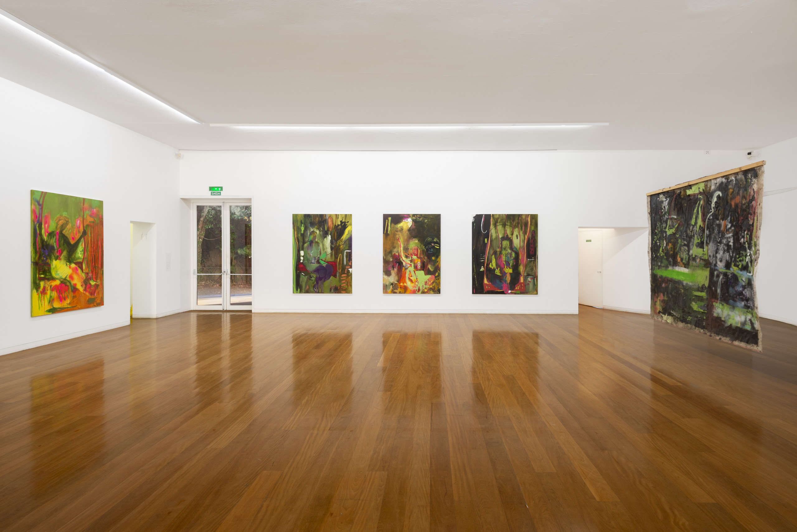 In other works from that exhibition, the figures insinuate themselves into the fragments, shredded amid a fog of colored gases. They are beings that are torn, shredded, pierced or that allow themselves to be contaminated by space, until there is no distinction between body and surroundings, in a kind of limitless continuity. The work that gave that show its title, Palafitas, on display here at the Iberê Foundation, produces a strong and emblematic image of this ghostly aspect that Luciana Maas’s work has continued to present ever since. In that painting, four of those bodies – or visions – stand on stilts. With the exception of the volume on the left, made with white paint and partially painted with green and, in part of the outline, red, the others are “licked”, or swallowed, by the same viscous matter as the background. There is no hint of fire in the image, and yet these characters seem absorbed by dark flames, perhaps from a hot night burning their skin. Nor does the painting inspire anything religious; and yet there is something evocative of Christ’s Golgotha. A monstrous scene, with obvious pain, but without sentimental affectations.