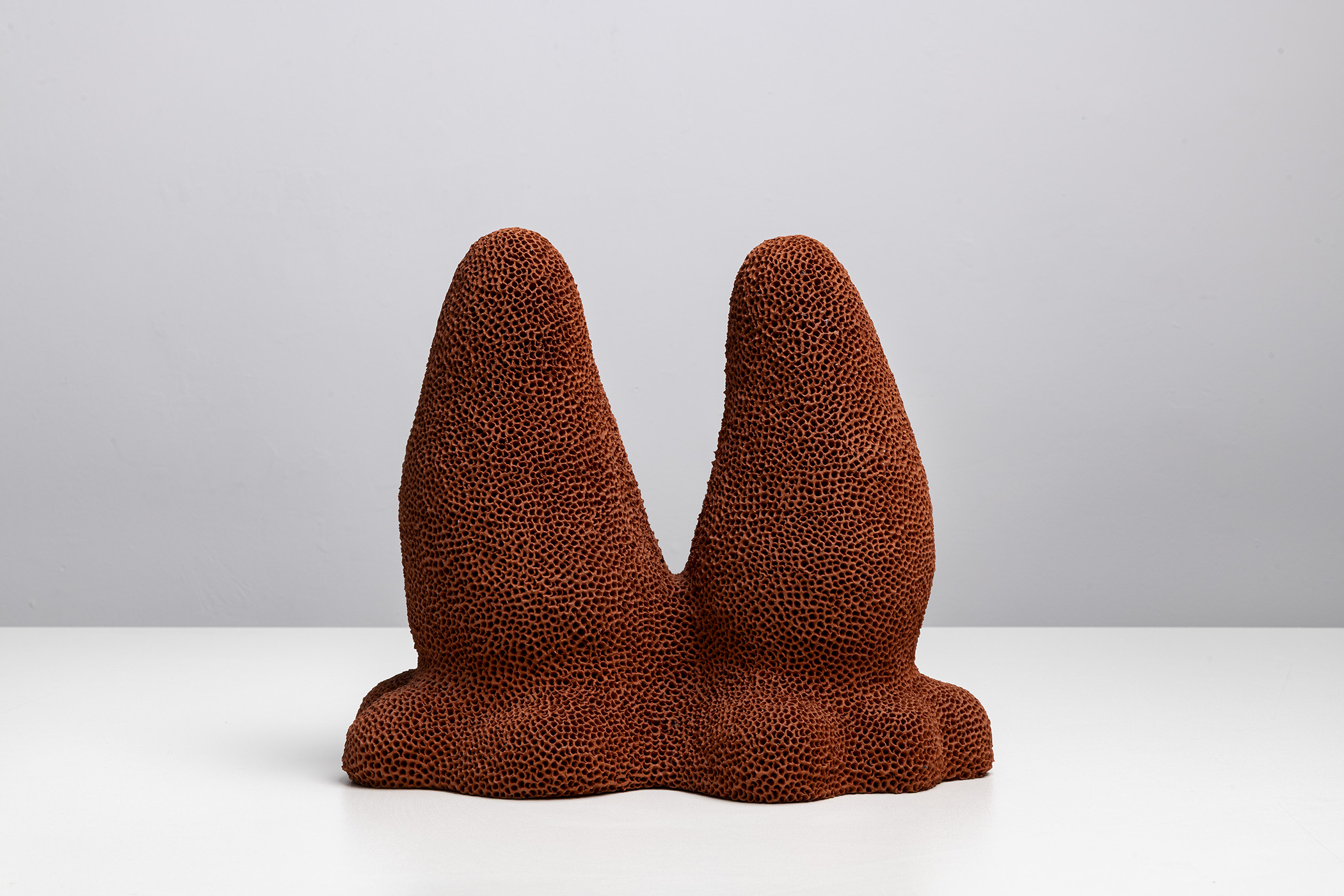 Nas formas biomórficas de Maria Alice, existe uma busca palpável por um erotismo em que os seres, normalmente isolados em sua individualidade, buscam a fusão com o outro. A cerâmica queimada, propositalmente deixada sem o pudor do esmalte ou do verniz, apresenta-se como pele — seca, porosa, oferecida. São corpos que parecem ter parado no exato momento em que a técnica se dissolve na terra.