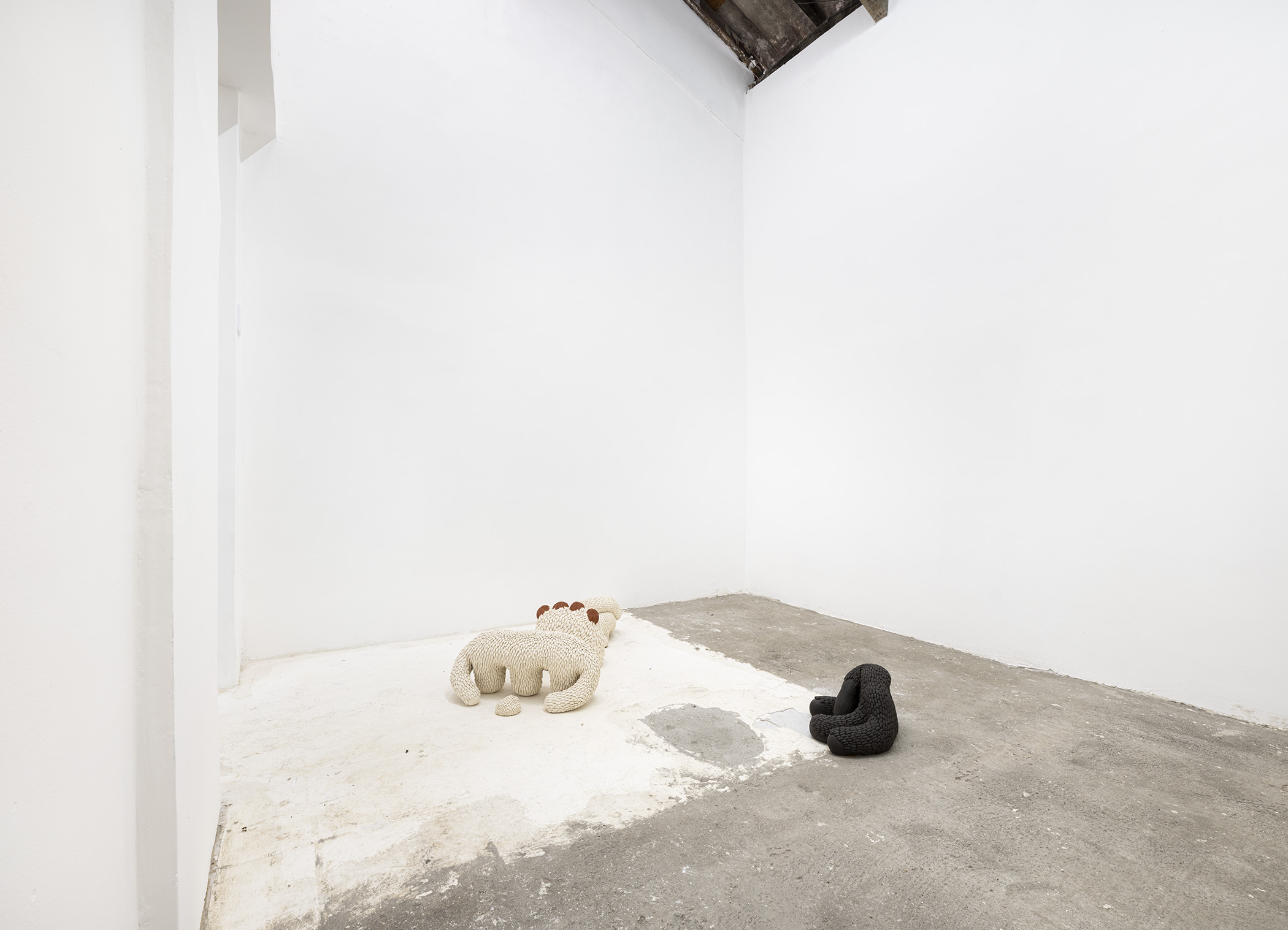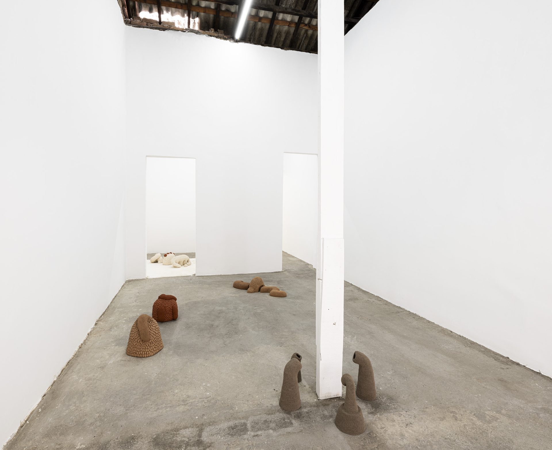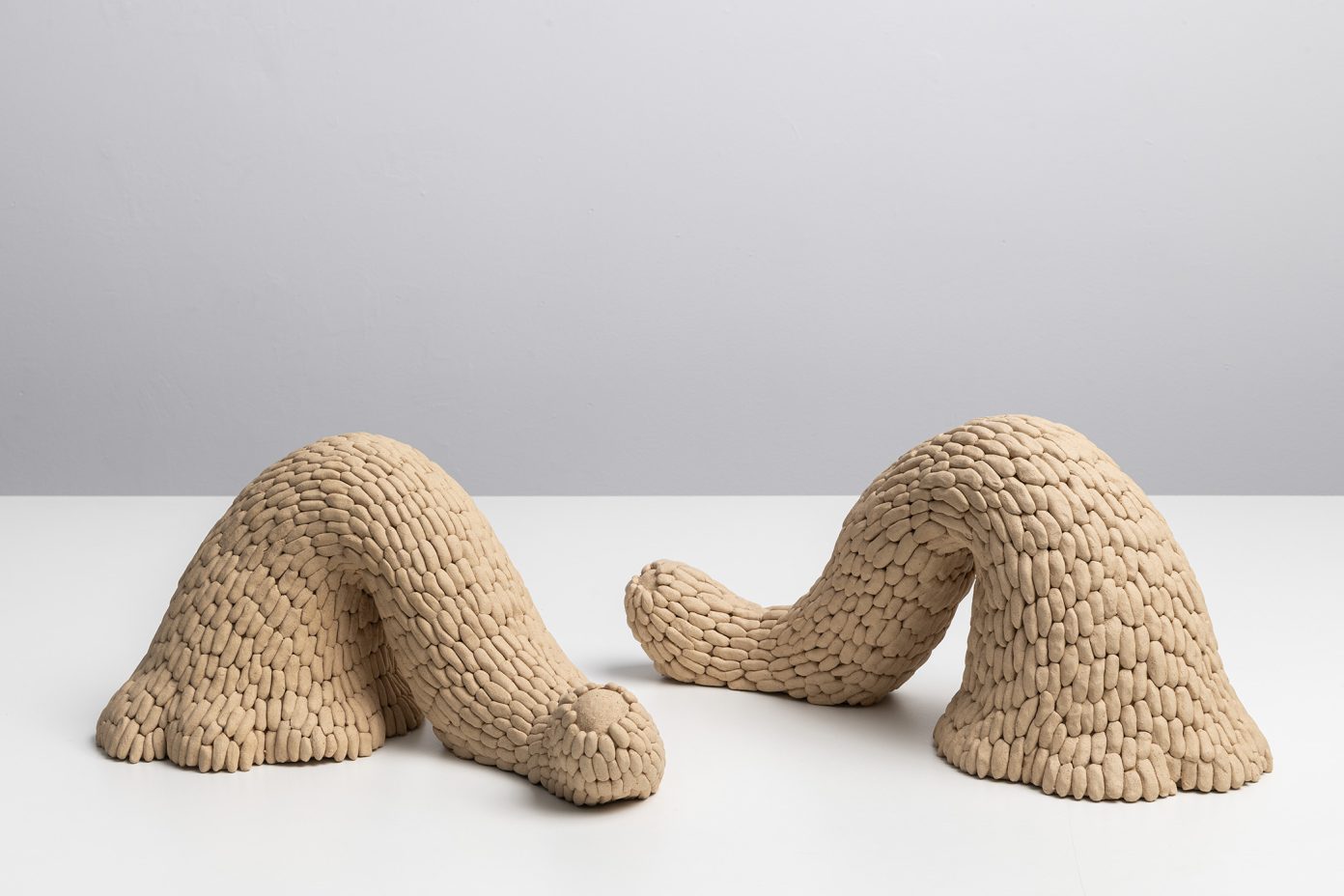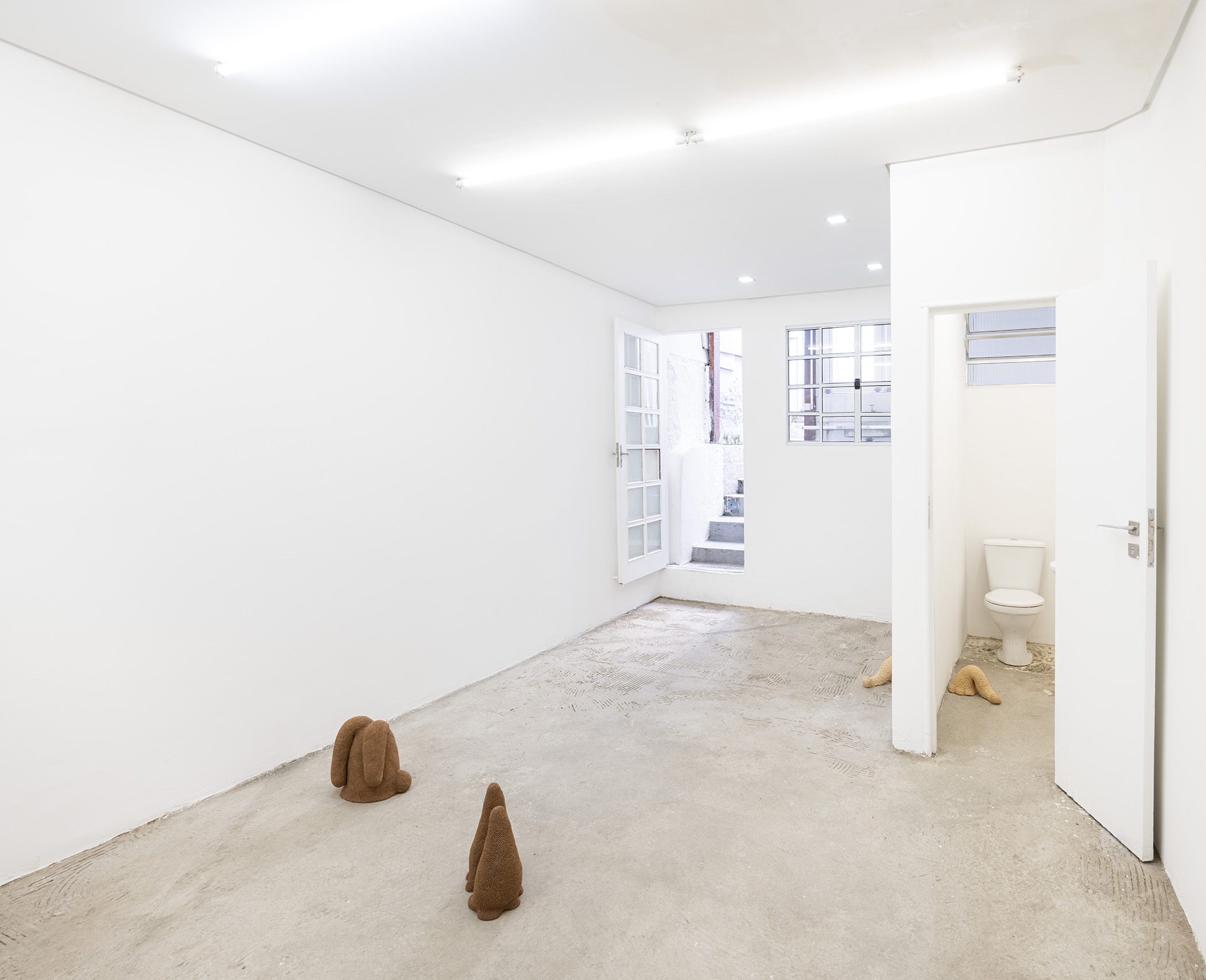 Ao observarmos a construção minuciosa dessas peças, podemos perceber uma pulsação obsessiva: centenas de pequenas unidades, como células ou sementes, aglomeram-se para formar um todo que parece vivo, musculoso e em constante torção. Essa repetição não é mecânica, mas sim orgânica e rítmica, sugerindo um crescimento que ignora os limites da escultura tradicional. É a matéria que se dobra sobre si mesma, num movimento de desejo que não conhece descanso. Há algo profundamente sensual na maneira como esses organismos se multiplicam e se acasalam no chão da galeria, uma sincronia de formas cujo único propósito é a beleza do encontro em si. O barro cru nos devolve ao tempo geológico de Ediacara — o título da exposição foi extraído do poema O Jardim de Ediacara, de Alan Shapiro — em que a vida florescia em pura presença, antes mesmo das funções biológicas rígidas, e os organismos multicelulares não tinham boca, intestino ou órgãos reprodutivos. Assim, a galeria em estado de ruína se transforma num jardim de prazeres primordiais.