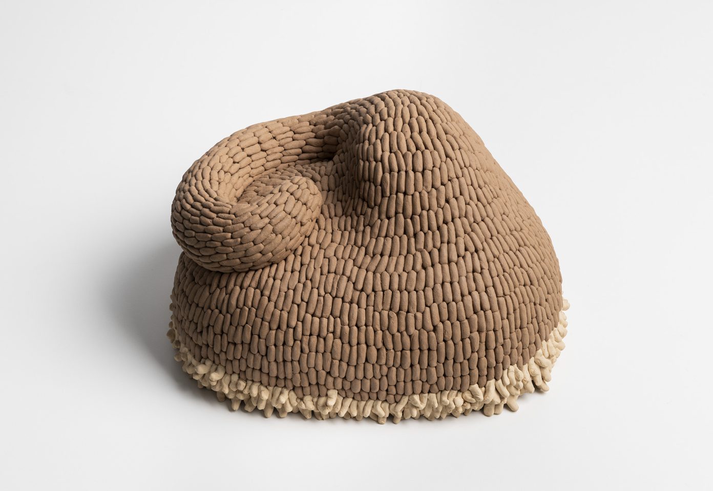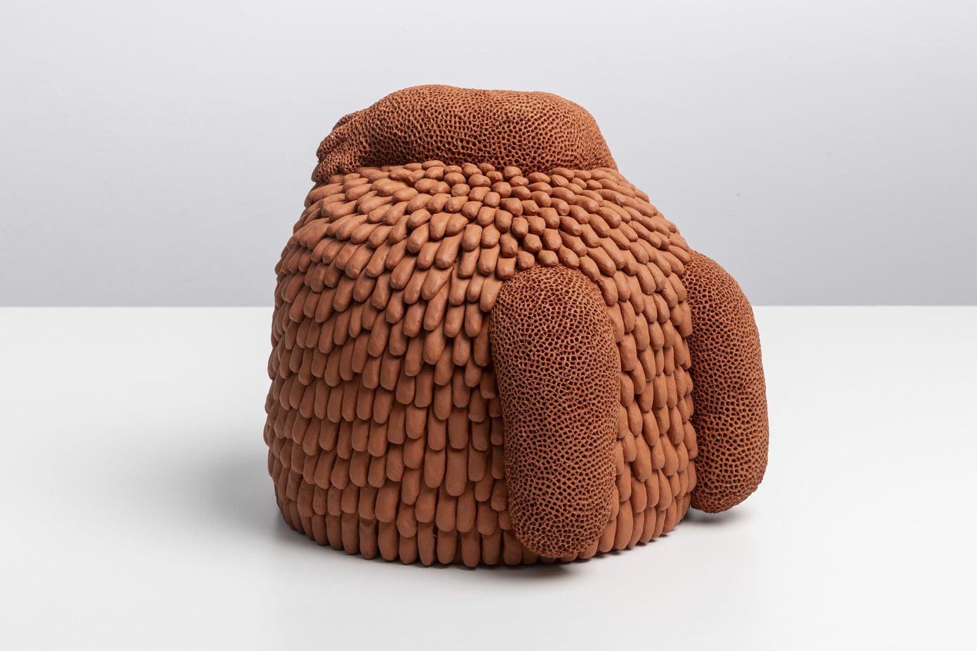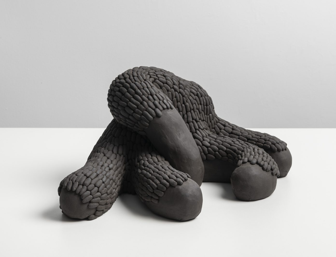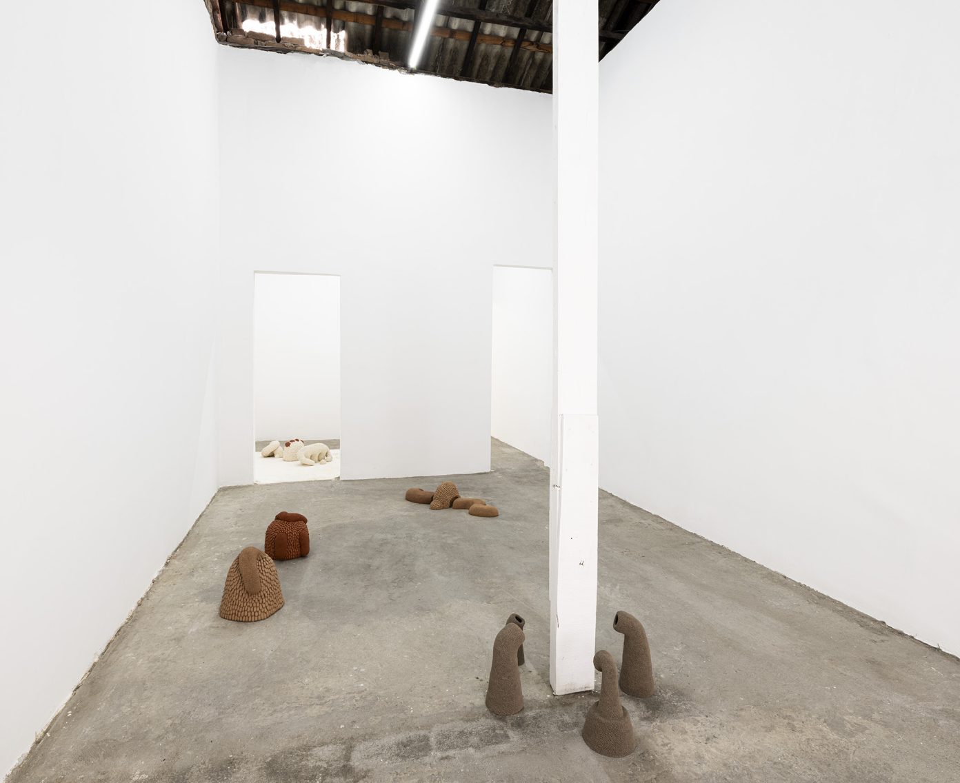 Ao observarmos a construção minuciosa dessas peças, podemos perceber uma pulsação obsessiva: centenas de pequenas unidades, como células ou sementes, aglomeram-se para formar um todo que parece vivo, musculoso e em constante torção. Essa repetição não é mecânica, mas sim orgânica e rítmica, sugerindo um crescimento que ignora os limites da escultura tradicional. É a matéria que se dobra sobre si mesma, num movimento de desejo que não conhece descanso. Há algo profundamente sensual na maneira como esses organismos se multiplicam e se acasalam no chão da galeria, uma sincronia de formas cujo único propósito é a beleza do encontro em si. O barro cru nos devolve ao tempo geológico de Ediacara — o título da exposição foi extraído do poema O Jardim de Ediacara, de Alan Shapiro — em que a vida florescia em pura presença, antes mesmo das funções biológicas rígidas, e os organismos multicelulares não tinham boca, intestino ou órgãos reprodutivos. Assim, a galeria em estado de ruína se transforma num jardim de prazeres primordiais.