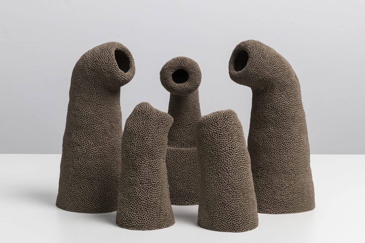 without glaze or varnish, presents itself as skin—dry, porous, offered. They are bodies that seem to